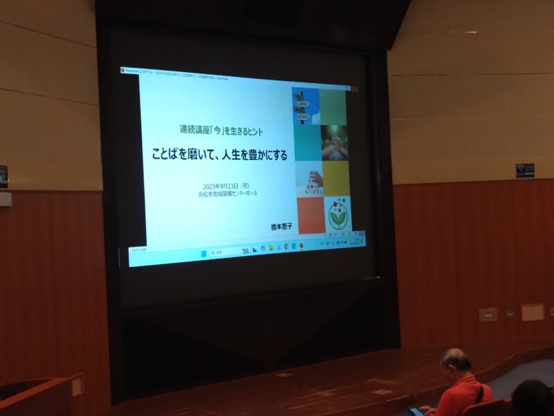 ライフサポートセンター静岡主催の「今を生きるヒント」というテーマで、県内3か所で開催する講演会に、おととしに続いてお声掛けいただきました。おととしは沼津会場でしたが、今年は9/23に浜松で「ことばを磨いて、人生を豊かにする」をタイトルで90分、ご参加の60人程の皆様とご一緒しました。