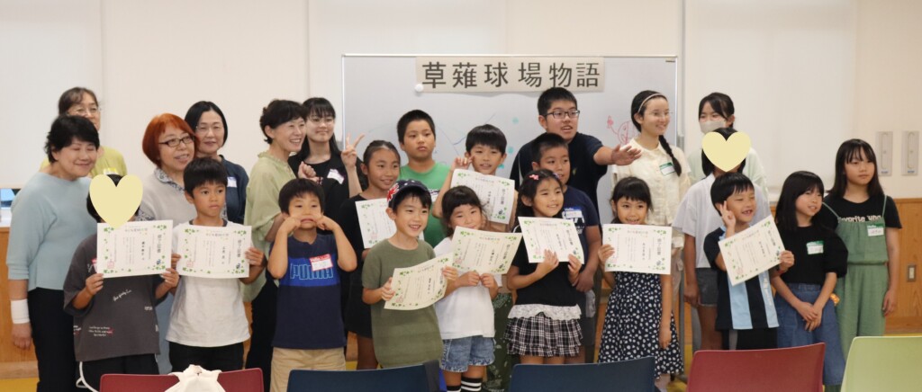 午前中は、声の出し方の基本を学んだあと球場見学を楽しみ、午後は、取材を重ねてまとめた全5編からなる「オリジナルストーリー」を、5チームに分かれて担当してもらいました。朗読指導者仲間にも協力をお願いし、個別の練習時間はわずか2時間弱でしたが、みんな満足の出来で、最後は修了証を手に、にっこり!!!!