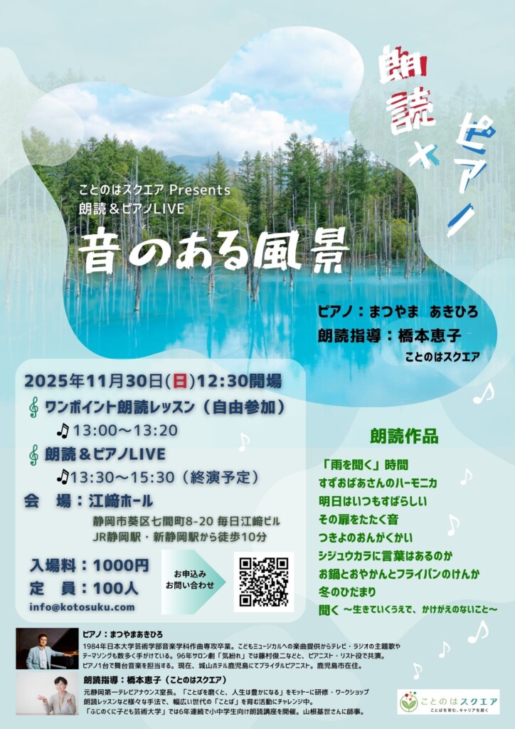 ことのはスクエア朗読レッスンの、レッスン生と即興ピアニスト・まつやまあきひろさんによる、スペシャルなLIVE。今年は、静岡市内で開催します。テーマは「音のある風景」。日常の生活の中で耳を澄ますと聴こえてくる「音」たち。お鍋とやかんの「音」、暖炉の音、鳥のことば、楽器の音色・・・親子連れでも楽しめる作品ばかりです。