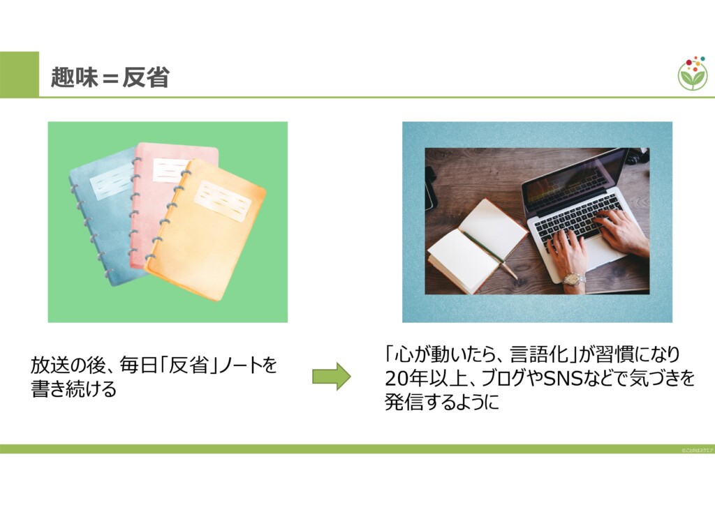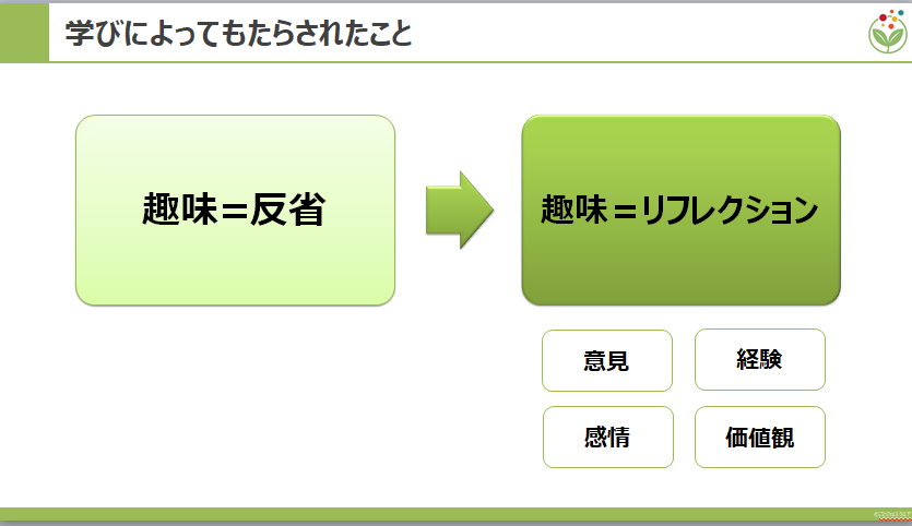 昨年末からの学びによって「趣味」=「反省」から「趣味」=「リフレクション」にバージョンアップしただけでなく「OS21認定リフレクションコーチ」としても、キャリア相談や研修に「リフレクション(ふりかえり)」を取り入れることが増えています。